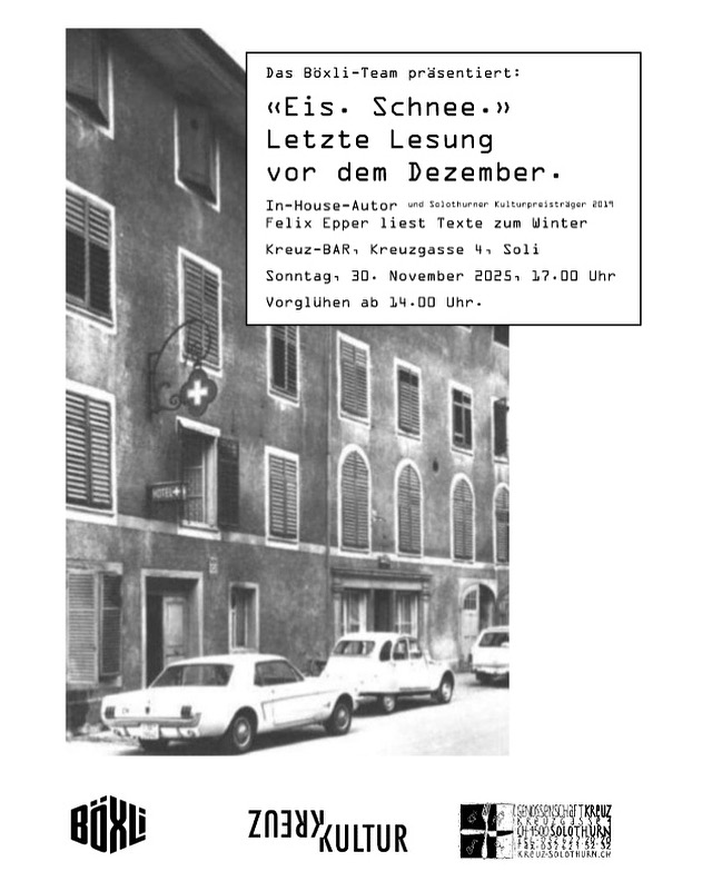 Epper liest… Veröffentlicht am 13. November 2025 von Felix Epper Das Böxli-Team präsentiert: Felix Epper liest Texte zum Winter Kreuz-Bar, Kreuzgasse 4, Solothurn Sonntag, 30. November 2025, 17.00 Uhr Vorglühen ab 14.00 Uhr. Lesung Felix Epper Felix Epper, lebt und schreibt in Solothurn. Alle Beiträge von Felix Epper ansehen →